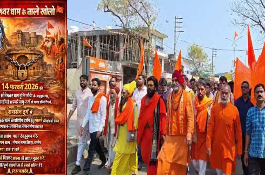 रायसेन। मध्यप्रदेश के रायसेन स्थित ऐतिहासिक सोमेश्वर धाम मंदिर को आम श्रद्धालुओं के लिए पूरे साल खोलने की मांग को लेकर साधु संतों ने प्रशासन के खिलाफ मोर्चा खोल दिया है इस मांग के समर्थन में पाटनदेव हनुमान मंदिर से यात्रा निकाली गई जिसके बाद पूरे इलाके में धार्मिक हलचल तेज हो गई। महाशंखनाद सोमेश्वर…