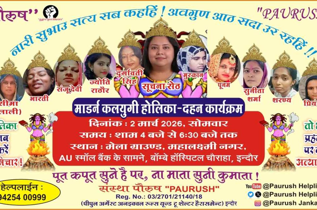 इंदौर। इंदौर में मेन्स राइट्स के लिए कार्यरत पौरुष संस्था 2 मार्च को शाम 4 बजे से 6:30 बजे के बीच महालक्ष्मी नगर मेला ग्राउंड, एयू बैंक के सामने पुष्प विहार कॉलोनी मेन रोड पर 11 चेहरों वाली “मॉडर्न हत्यारी होलिका” का दहन करेगी। संस्था के अध्यक्ष एडवोकेट अशोक दशोरा ने बताया कि इस वर्ष…