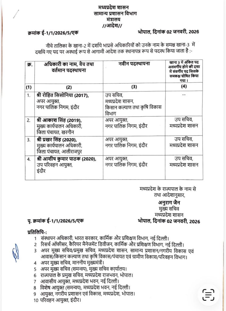 इसके साथ ही इंदौर नगर निगम को तीन नए अपर आयुक्त भी मिले हैं। इस संबंध में सामान्य प्रशासन विभाग की ओर से आधिकारिक आदेश जारी कर दिए गए हैं।