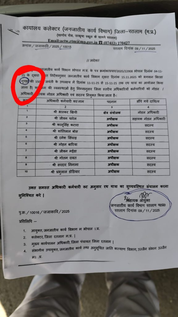 मध्य प्रदेश के रतलाम जिले में भगवान बिरसा मुंडा जयंती से ठीक पहले एक ऐसी गलती हो गई, जिसने पूरे आदिवासी समाज को आक्रोशित कर दिया। रतलाम जनजातीय विभाग की ओर से जारी एक आधिकारिक पत्र में भगवान बिरसा मुंडा की जगह “भगवान बिरसा गुंडा” लिखा गया। इस गंभीर त्रुटि ने समाज की भावनाओं को गहराई से आहत किया और लोग इसे अपनी आस्था पर सीधी चोट बता रहे हैं।