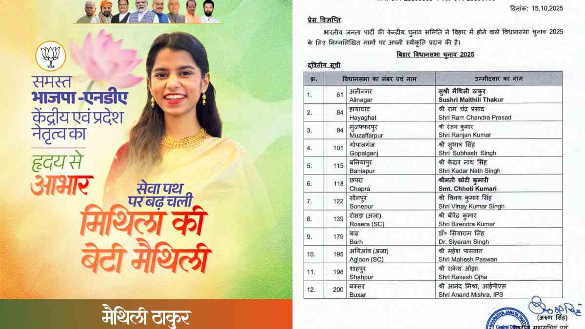 पटना: बिहार विधानसभा चुनाव 2025 की तैयारियों के बीच भारतीय जनता पार्टी ने अपनी दूसरी प्रत्याशी सूची जारी की है। इस सूची में सबसे चर्चित नाम लोकगायिका मैथिली ठाकुर का है, जिन्हें अलीनगर विधानसभा सीट से बीजेपी का उम्मीदवार बनाया गया है।