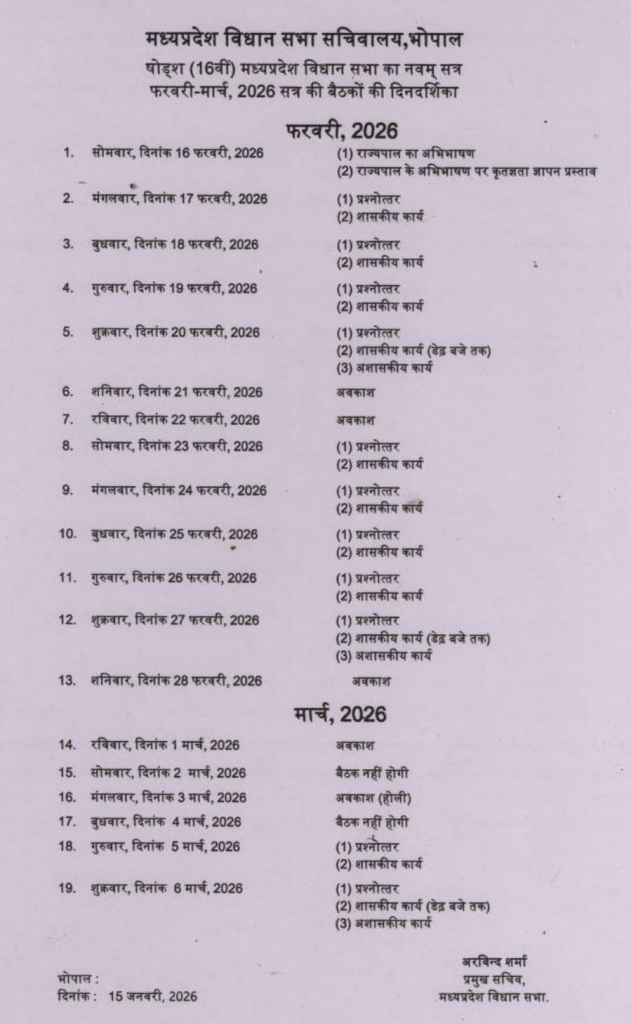 भोपाल। मध्य प्रदेश विधानसभा का बजट सत्र इस बार 19 दिनों का होगा, जिसे लेकर विधानसभा सचिवालय ने अधिसूचना जारी कर दी है। अधिसूचना के अनुसार बजट सत्र की शुरुआत 16 फरवरी 2026 से होगी और यह 6 मार्च 2026 तक चलेगा, इस दौरान कुल 12 बैठकें आयोजित की जाएंगी।