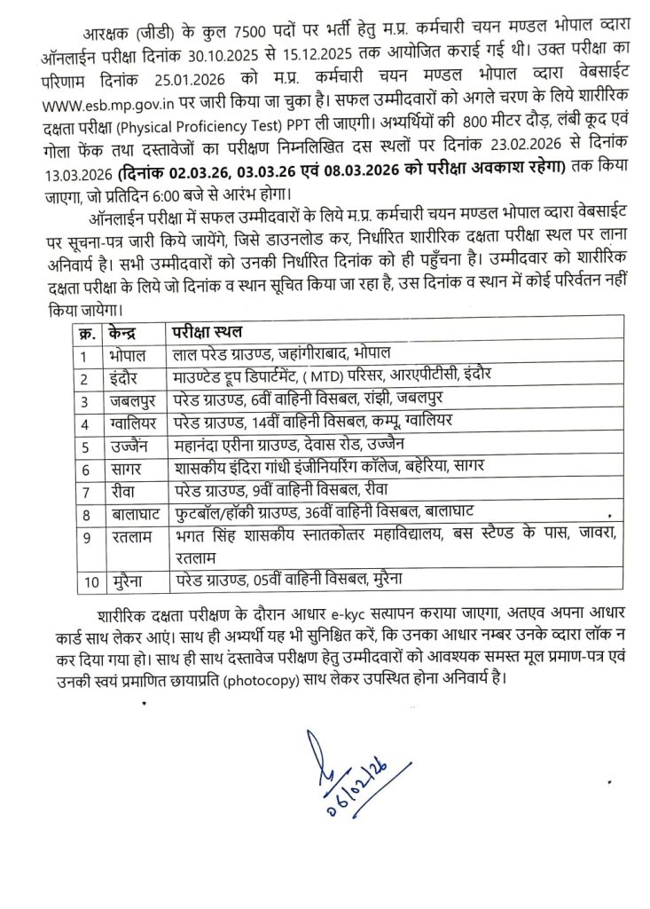 मध्य प्रदेश कर्मचारी चयन मंडल द्वारा आरक्षक जीडी के कुल 7500 पदों पर भर्ती प्रक्रिया चलाई जा रही है, इसके तहत 30 अक्टूबर 2025 से 15 दिसंबर 2025 तक ऑनलाइन लिखित परीक्षा आयोजित की गई थी, जिसका परिणाम 25 जनवरी 2026 को घोषित कर दिया गया है।
