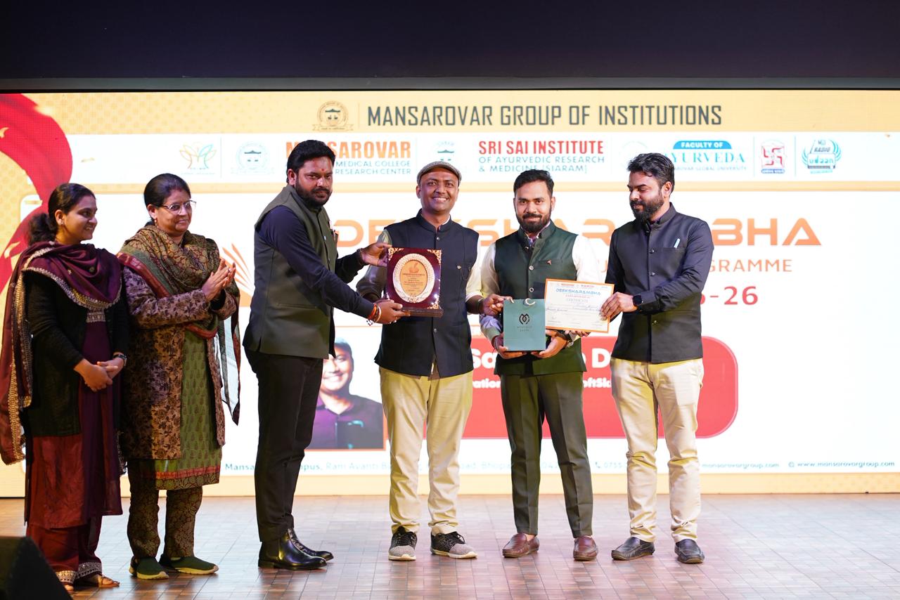 भोपाल: मानसरोवर ग्रुप ऑफ इंस्टीट्यूशन्स के तीनों आयुर्वेद महाविद्यालयों, मानसरोवर आयुर्वेदिक मेडिकल कॉलेज हॉस्पिटल एवं रिसर्च सेंटर, श्री साईं इंस्टीट्यूट ऑफ आयुर्वेदिक रिसर्च एंड मेडिसिन और फैकल्टी ऑफ आयुर्वेदा, मानसरोवर ग्लोबल यूनिवर्सिटी में जारी दीक्षांरभ 2025 में शनिवार को कवि, मोटिवेशनल स्पीकर सहित आयुष मंत्रालय से आए विषय विशेषज्ञों ने विद्यार्थियों को संबोधित किया। कार्यक्रम का आयोजन हिनोतिया आलम स्थित मानसरोवर प्रांगण में किया गया जिसमें नवप्रवेशित भावी वैद्यों ने हिस्सा लिया।