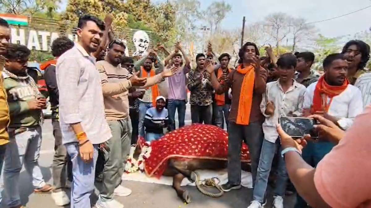 मृत गौवंश को सड़क पर रखकर प्रदर्शन… निगम पर अंतिम संस्कार के नाम पर पैसे लेकर नाली में फेंकने का आरोप