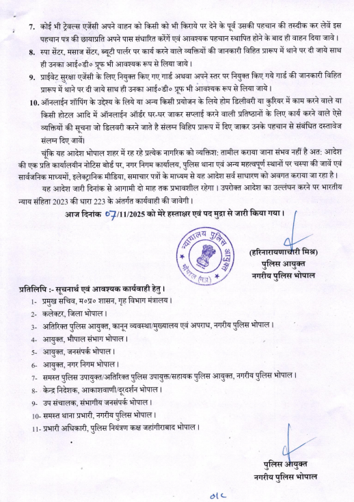 भोपाल। भोपालवासियों के लिए बेहद जरूरी खबर सामने आई है। राजधानी में बढ़ते जोखिमों और सुरक्षा चुनौतियों को देखते हुए पुलिस कमिश्नर हरिनारायणचारी मिश्र ने नए सख्त निर्देश जारी कर दिए हैं। अब कोई भी मकान, होटल या रिसॉर्ट मालिक अपने यहां कमरा या मकान किराये पर देने से पहले किरायेदार की पूरी जानकारी पुलिस को देना अनिवार्य होगा। यह जानकारी मध्यप्रदेश पुलिस सिटिजन ऐप या संबंधित थाने में जमा करनी होगी।