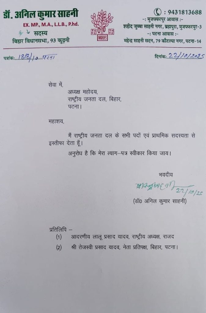 सूत्रों के मुताबिक, अनिल सहनी अपने बेटे को कुढ़नी सीट से टिकट दिलाना चाहते थे, मगर पार्टी ने इस बार बबलू कुशवाहा को उम्मीदवार बना दिया। इसी नाराज़गी के बाद उन्होंने इस्तीफा भेजा और भाजपा में शामिल होने का फैसला कर लिया।
