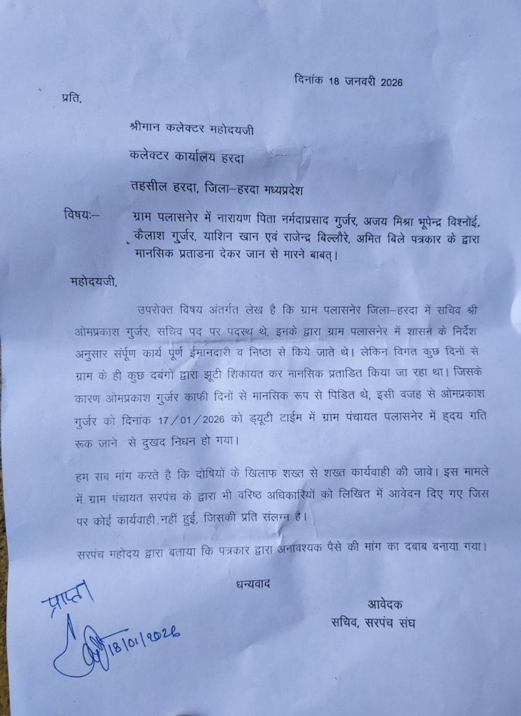 आरोप है कि शनिवार को भी जांच से जुड़ी गतिविधियों के कारण सचिव पर अत्यधिक तनाव बढ़ा, जिससे ड्यूटी के दौरान उनकी तबीयत बिगड़ी और उनकी जान चली गई। सरपंच का कहना है कि यह घटना सुनियोजित मानसिक प्रताड़ना का परिणाम है। उन्होंने बताया कि इस संबंध में पहले भी वरिष्ठ अधिकारियों को लिखित शिकायत दी गई थी, लेकिन कोई कार्रवाई नहीं हुई। अब सरपंच संघ और सचिव संघ ने उपसरपंच सहित सात लोगों के खिलाफ सख्त कानूनी कार्रवाई की मांग की है और चेतावनी दी है कि यदि दोषियों पर कार्रवाई नहीं की गई तो आंदोलन किया जाएगा।